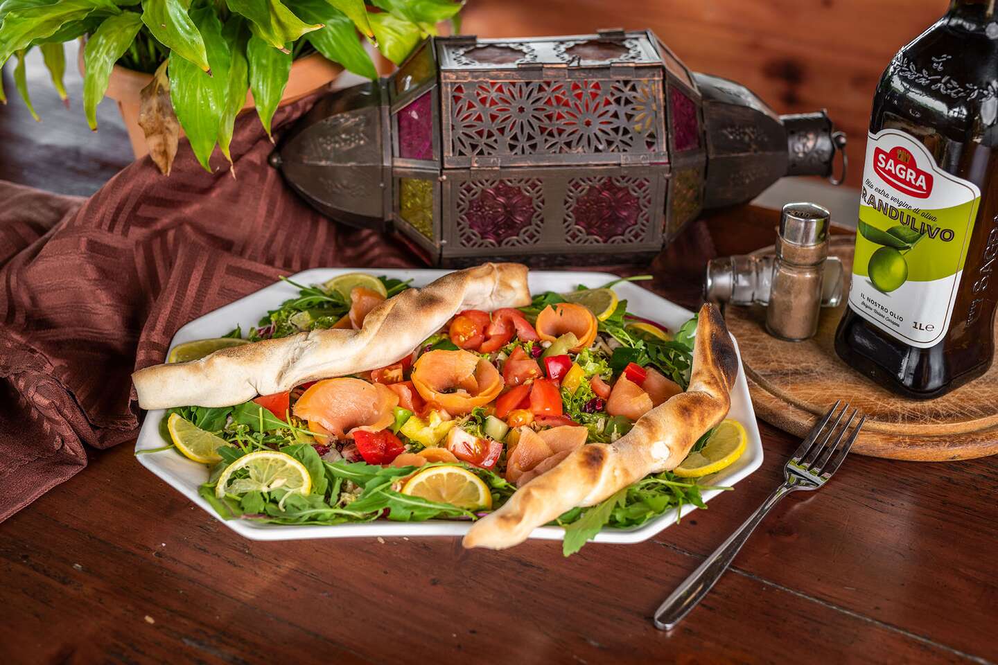Zeleninový šalát s údeným lososom, olivovým olejom a bagetkou v reštaurácii Oáza pri Draždiaku
